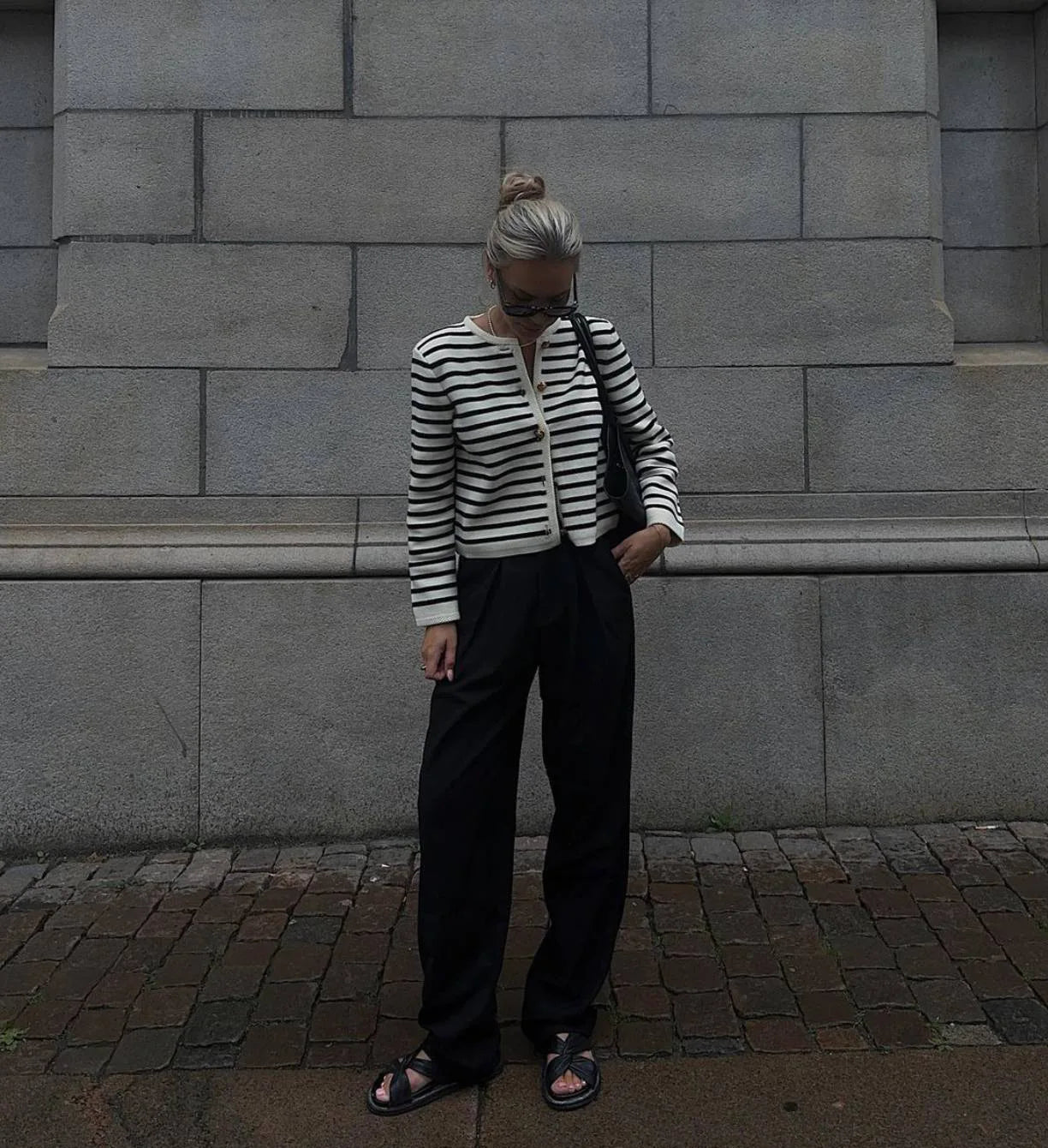 חליפת פסים מיני סרוגה דגם "נוי" – חליפה קז'ואלית ומסוגננת שמושלמת לעונת הסתיו והחורף. עשויה מ-96% פולי'סטר עם סיבים סינתטיים, גמישה ונעימה למגע, בעלת גזרה רגולרית שמתאימה לכל מבנה גוף. החולצה עם צווארון עגול ושרוולים ארוכים, והחצאית בגזרה מיני עם מותן גמיש לנוחות מקסימלית. עיטורים של כפתורים, כיסים ופיסול מדויק מוסיפים לסטייל הייחודי. מושלמת למראה יומיומי ומרשים, עם פסים אופנתיים שמביאים טאץ' טרנדי לכל הופעה.